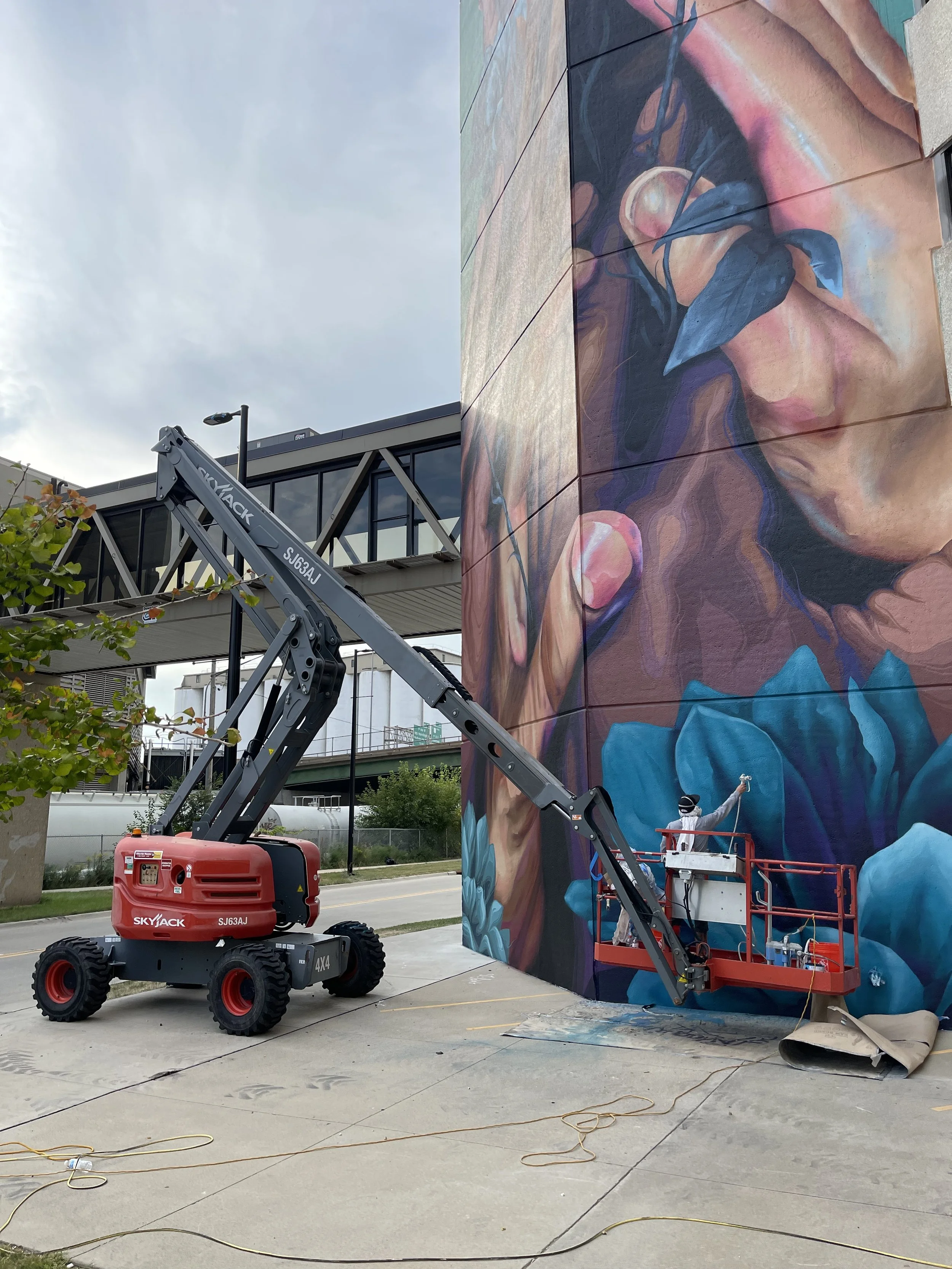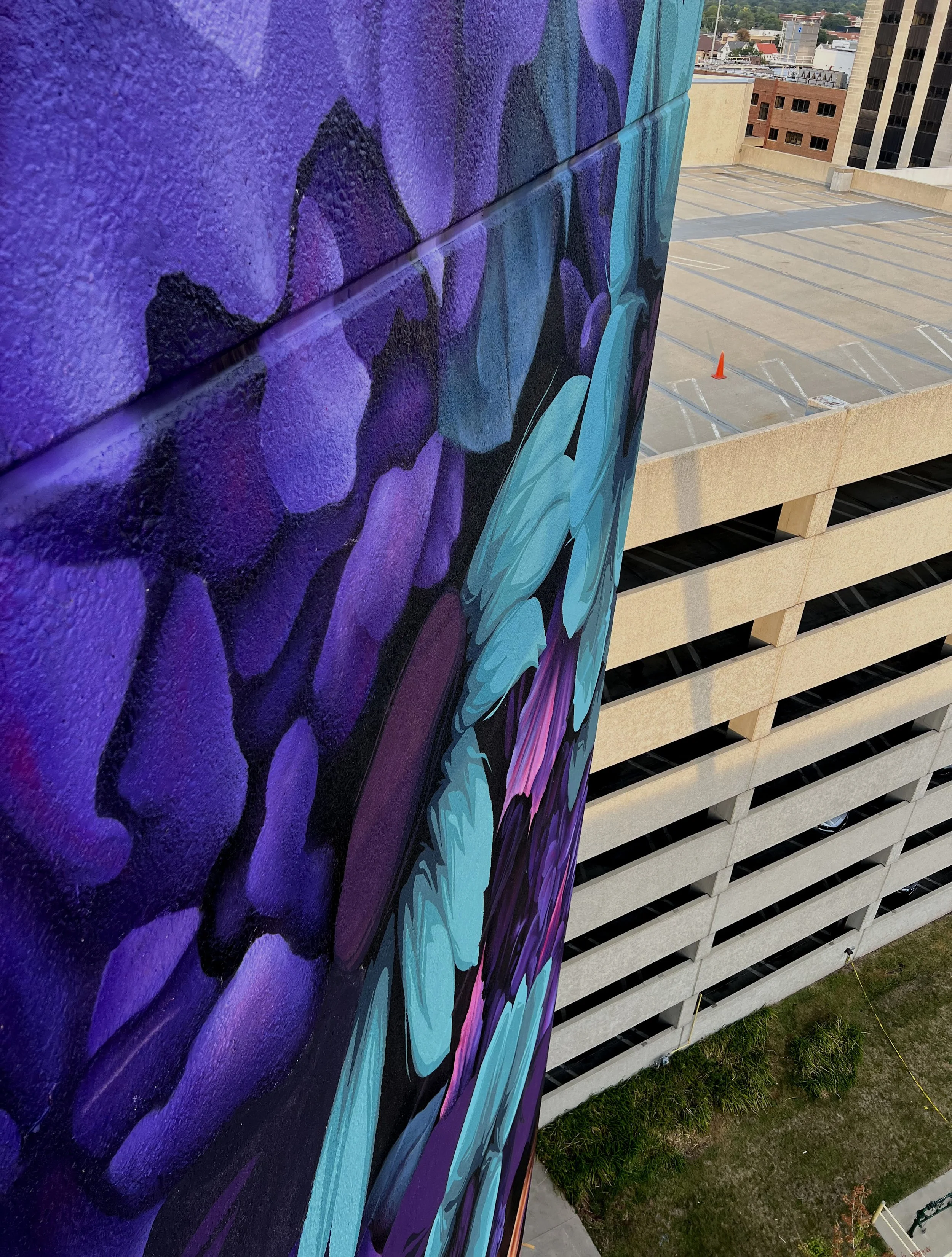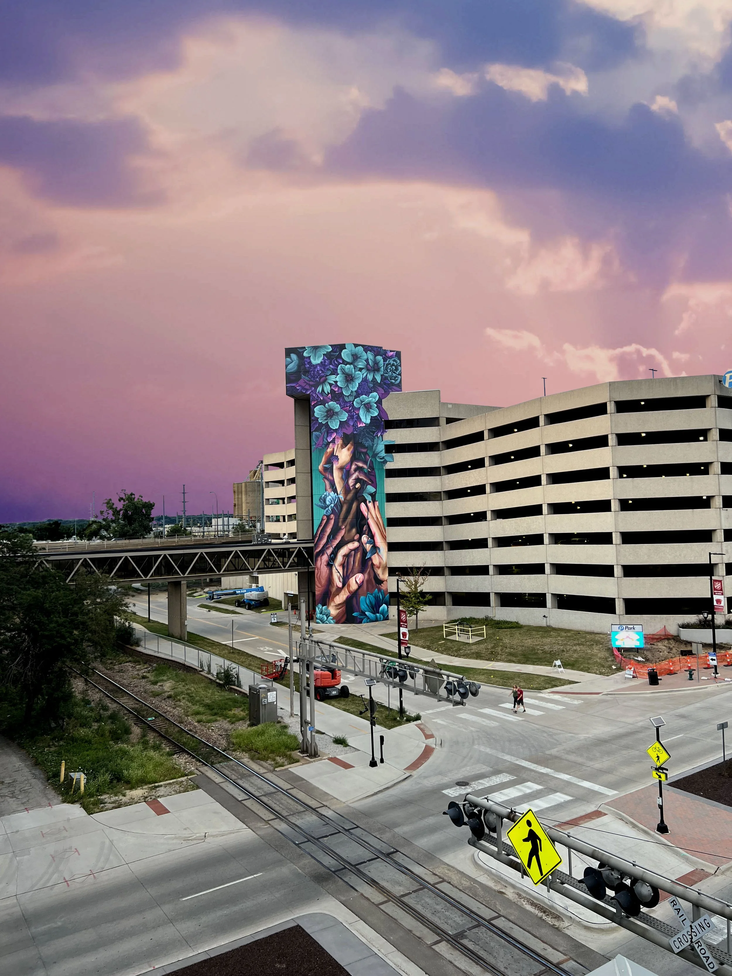 Together We Bloom is a monumental mural by VAST Projects, located in downtown Cedar Rapids, Iowa. Rising across the façade of a multi-story parking structure, the mural measures over 7,000 square feet and serves as a powerful symbol of growth, resilience, and community connection.